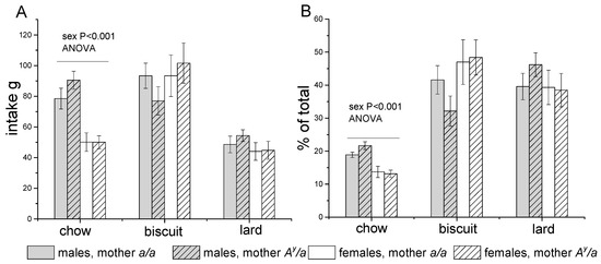 Males and females differed in their taste preferences (p < 0.01, three-way ANOVA, “sex” * “type of food”). Females consumed almost two times less standard chow than males and did not differ from males in the amount of consumed biscuits and fat. Females showed a preference for biscuits and consumed twice as many biscuits compared to pellets of standard chow or lard (Figure 3A). In males, the consumption of pellets of standard chow and biscuits did not differ, and they consumed less fat. The contribution of each of the components of the diet to total energy intake is shown in Figure 3B. The share of energy consumed with the SD was half that with each of the other components of the diet, while the share of energy consumed with lard and biscuits did not differ from each other. The share of energy consumed with the SD in females was lower than in males. Maternal obesity did not have a statistically significant effect on the choice of diet components.