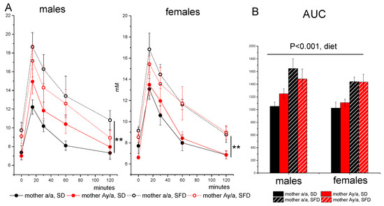 Blood glucose concentrations (A) and areas under curves (B) during i.p. glucose tolerance test in male and female offspring of control (a/a) and obese (Ay/a) mothers. Male and female offspring were fed with SD or SFD during 10 weeks from the age of 10 weeks. Data are presented as mean ± SE. The number of animals in groups is shown in Table 2. Data were analyzed by repeated measures ANOVA with factors “sex”, “diet”, and “MG” for five repeated measures of glucose in blood, and by three-way ANOVA with factors “sex”, ‘diet”, and “MG” for AUC: ** p < 0.01, diet, repeated measures ANOVA.