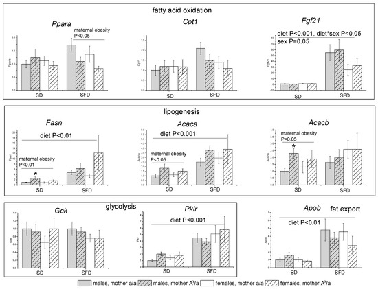 Liver gene expression in male and female offspring of control and obese mothers under consumption of SD or SFD. Male and female offspring of obese (Ay/a) and control (a/a) mothers were fed with SD or SFD for 10 weeks from the age of 10 weeks. Data are presented as mean ± SE for 5–7 mice in each group. Y axis designates fold changes in gene expression as compared to group of SD males born to control (a/a) mothers. Data were analyzed by three-way ANOVA with factors “sex”, “diet”, and “MG” and separately for SD and SFD by two-way ANOVA with factors “sex” and “MG”. * p < 0.05, post hoc Newman–Keuls test between male offspring of a/a and Ay/a mothers.