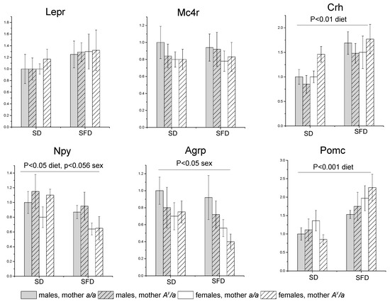 In the hypothalamus, SFD consumption increased gene expression of anorexigenic factors (Crh and Pomc) and decreased gene expression of orexigenic factor Npy in mice of both sexes and had no effect on the expression of the genes for the leptin receptor and for MC4R (Figure 6). Gene expression of orexigenic factors (Npy and Agrp) in females was lower than in males. Maternal obesity did not affect the expression of the studied genes in the hypothalamus.