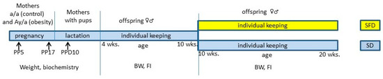 Experimental design. The top line shows the mice under study, and the bottom line shows the measured parameters. Blue color indicates the period of consumption of the standard diet; yellow color—the period of consumption of the sweet and fatty diet. There were 6 experimental groups of mothers (Ay/a and a/a mothers at PP5, PP17, and PPD10) with 7 females in each group, and 8 experimental groups of the offspring: 6 male and 8 female offspring of Ay/a mothers and 7 male and 7 female offspring of a/a mothers that consumed SFD; 5 male and 8 female offspring of Ay/a mothers and 7 male and 8 female offspring of a/a mothers that consumed SD. FI – food intake.
