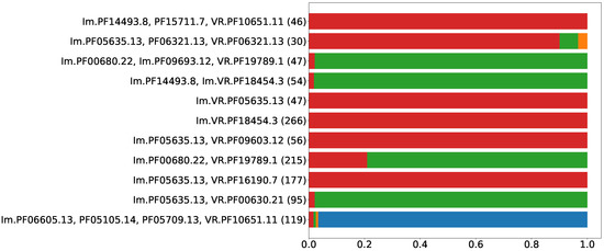 Proportions of gene arrangements among selected Pfam compositions. Numbers in brackets show amount of sequences containing given Pfam composition. Colors show proportions of Pfam arrangements for a composition and are unrelated for different Pfam compositions.
