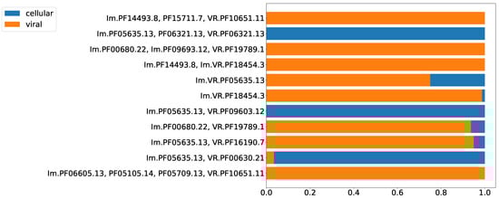 Proportion of viral and cellular residence for selected Pfam compositions.