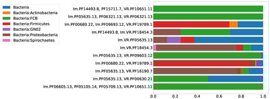 Proportions of major DGR clades within major prokaryotic taxa for eleven selected Pfam compositions.