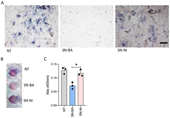 B. abortus-infected adipocytes inhibit osteoblast differentiation. Pre-osteoblasts were differentiated in the presence of culture supernatants from B. abortus-infected adipocytes at multiplicity of infection (MOI) 100 (SN-BA) or culture supernatants from non-infected adipocytes as control (SN-NI). Scale bar: 50 µm. Alkaline phosphatase (ALP) activity was revealed by staining with BCIP-NBT solution (A,B). Quantification of ALP activity was performed on 2 mg total protein of cell lysates incubated with pNPP for 10 min at 37 °C. The absorbance was measured at 420 nm on a microplate reader (C). NT: non-treated. * p < 0.001 vs. cells treated with culture supernatants from non-infected adipocytes (SN-NI).