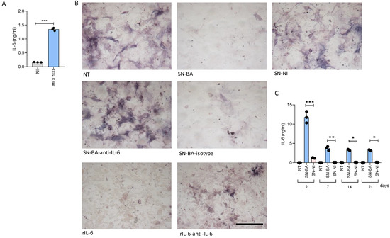 B. abortus-infected adipocytes inhibit osteoblast differentiation largely due to IL-6. IL-6 in adipocyte culture supernatants were detected by ELISA 24 h after B. abortus infection (A). Pre-osteoblasts were differentiated in the presence of culture supernatants from B. abortus-infected adipocytes at MOI 100 (SN-BA) or culture supernatants from non-infected adipocytes as control (SN-NI). Supernatants were incubated with an anti-IL-6 neutralizing antibody (SN-Ba-anti-IL-6) or isotype control (SN-BA-Isotype). Recombinant mouse IL-6 (rIL-6, 1 ng/mL) was used as a positive control. Osteoblast differentiation was measured by staining ALP activity (B). IL-6 secretion was measured at different times during the osteoblast differentiation process carried out in the presence of culture supernatants from B. abortus-infected adipocytes at MOI 100 (SN-BA) or culture supernatants from non-infected adipocytes (SN-NI) by ELISA (C). NT: non-treated. Scale bar: 50 µm. * p < 0.001, ** p < 0.001, and *** p < 0.0001 vs. cells treated with culture supernatants from non-infected cells (SN-NI).