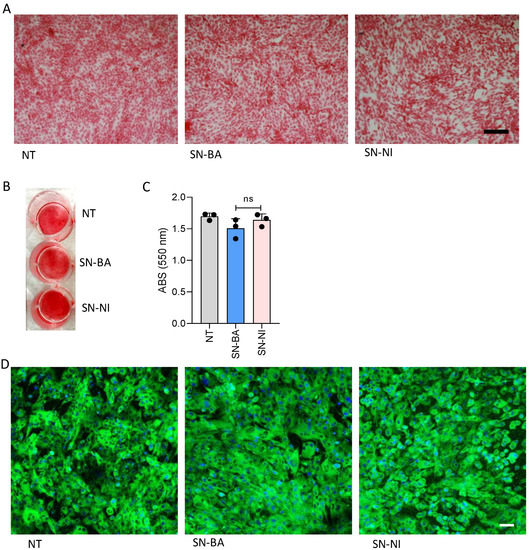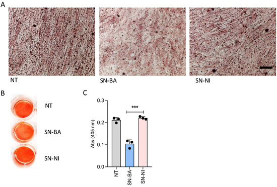 B. abortus-infected adipocytes inhibit mineral matrix deposition by osteoblasts. Effects of culture supernatants from B. abortus-infected adipocytes (SN-BA) on mineral deposition by osteoblasts. Culture supernatants from non-infected adipocytes (SN-NI) were used as control (A,B). Calcium deposition was revealed by spectrophotometric quantification (C). NT: non-treated. Scale bar: 50 µm. *** p < 0.0001 vs. cells treated with culture supernatants from non-infected adipocytes (SN-NI).