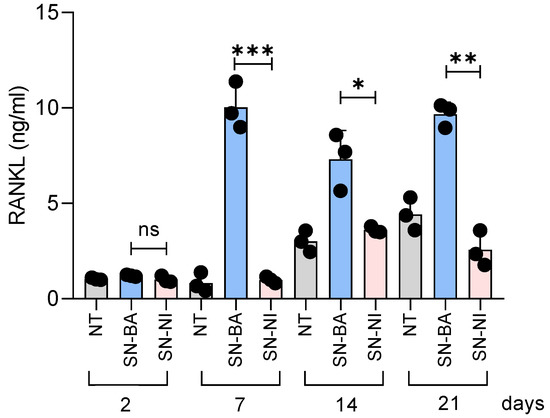 Culture supernatants from B. abortus-infected adipocytes induce RANKL expression by osteoblasts. RANKL production by osteoblasts stimulated with supernatants from B. abortus-infected adipocytes (SN-BA) or from adipocytes that were not infected (SN-NI) was determined in cell lysates by ELISA. NT: non-treated. * p < 0.001, ** p < 0.001, and *** p < 0.001 vs. cells treated with culture supernatants from non-infected cells (SN-NI). ns: non-significant.