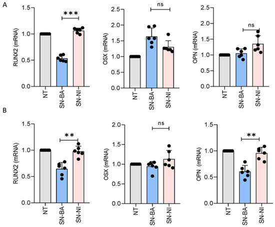 Culture supernatants from B. abortus-infected adipocytes inhibit Runt-related transcription factor 2 (Runx2) transcription by osteoblasts. Effects of culture supernatants from B. abortus-infected adipocytes (SN-BA) on osteoblast differentiation transcription factors. Runx2, Osterix (Osx), and osteopontin (OPN) transcription were determined by RT-qPCR at day 1 (A) and at day 14 (B) post-stimulation. Cells stimulated with culture supernatants from non-infected adipocytes (SN-NI) were used as control. NT: non-treated, ** p < 0.001, *** p < 0.0001 vs. cells treated with culture supernatants from non-infected cells (SN-NI). ns: non-significant.