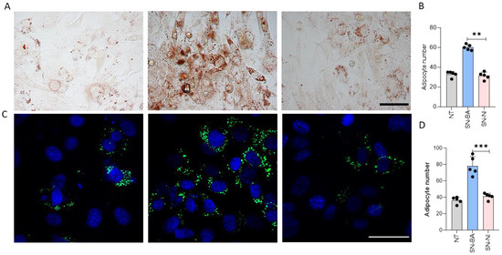 Culture supernatants from B. abortus-infected osteoblasts induce adipogenesis. Effect of culture supernatants from B. abortus-infected osteoblasts on adipocyte differentiation determined by lipid droplet staining with Oil Red O (A), quantified by cell counts (44,940 µm2) (B) and Bodipy 493/503 staining (24,000 µm2) (C), quantified by cell counts (D). NT: non-treated. Scale bar: 50 µm. ** p < 0.001, and *** p < 0.0001 vs. cells treated with culture supernatants from non-infected cells (SN-NI).