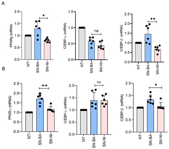 B. abortus-infected osteoblasts modulate adipocyte transcription factors. Effect of infected culture supernatants on peroxisome proliferator-activated receptor γ (PPAR-γ), CCAAT enhancer binding protein α (C/EBP-α), and β (C/EBP-β) transcription determined by RT-qPCR in adipocytes at days 1 (A) and 14 (B) post-stimulation. NT: non-treated. * p < 0.001, and ** p < 0.001 vs. cells treated with culture supernatants from non-infected cells (SN-NI). ns: non-significant.