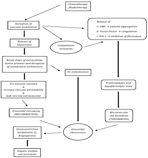 Pathogenesis of SOS/VOD, chemotherapy, and radiation injure endothelial cells (ECs), activate both them and their complement, and disrupt cytoskeletal architecture. Fluid and blood elements enter the extravascular space of Disse and nearby tissues, promoting sinusoidal narrowing, decrease in blood flow, and obstruction.