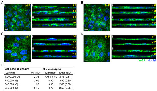 The thickness of the iBMEC monolayer grown for two or three days on ThinCert® filters was determined based on 3D confocal micrographs. After formaldehyde fixation, the cells were stained with 5 µg/mL Alexa Fluor 488 conjugated WGA for 10 min. After that, the cells were washed three times with DPBS, permeabilised with 0.1% Triton X-100, blocked with 2% BSA in 0.05% PBS-TX, and stained with primary and secondary antibodies and Hoechst as described above. The mounted cells were imaged with a spinning disk confocal microscope and a 100× silicone objective. The images were reconstructed using Arivis Vision 4D software (version 3.4, Arivis AG, Rostock, Germany) and the thickness of several different regions and images were measured as the height of the cross-section views.