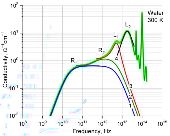 The model spectral pyramid of the dielectric response of liquid water (see also Figure 10 in Ref. [27]) superimposed on reference data obtained from Ref. [28]. Numbers 1–4 notate separate spectral components. Letters are the common notations of the spectral bands (R1 is famous Debye relaxation).