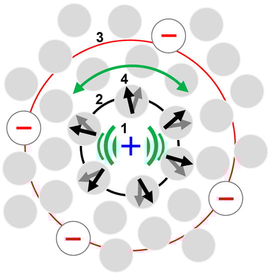 The 5-THz molecular oscillator in liquid water. 1—the vibrating H3O+ ion (see also Figure 12 in Ref. [27]); 2—the hydration shell; 3—the ion cloud; 4—librating H2O dipoles (black/grey arrows); shown are the ion vibrations (green rattling) and arrows swinging (green double arrow). Shadowed circles are H2O molecules; open circles are ions OH−; red and blue signs “+” and “− “ show the ion charges.
