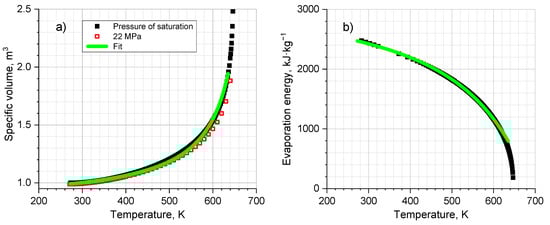 where for compactness. EVAP is the energy of decomposition of water into separate molecules, the energy of evaporation. Equation (4) is retained over a wide temperature range, 273–630 K. What is important and convenient for us, due to the incompressibility of water, is the fact that volume V practically does not depend on pressure (see Figure 3a). This makes it possible to use a simple fitting temperature dependence m3 (hereafter, temperature expressed in Kelvin).
