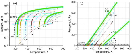 Isochores of liquid water in (a) log and (b) normal scales. The solid thick lines are the representative curves calculated according to Equation (7) for V = 1.01 and 1.3 m3 (N = 900 and 770 m−3). Reference points are taken from Ref. [30].