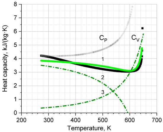 Heat capacity CV of liquid water vs. temperature. The solid line 1 is the fitting curve of Equation (9) to reference points of CV obtained from Ref. [30] (square points). Dashed lines 2 and 3 are the components of the CV(T) curve 1. CP is shown for completeness.