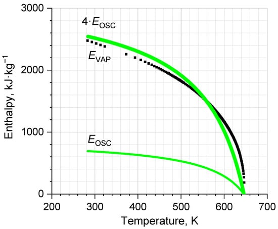 Comparison of the potential energy of an oscillator EOSC and the energy of decomposition (evaporation) of liquid water EVAP [30] to demonstrate the prediction of the equipartition principle: .