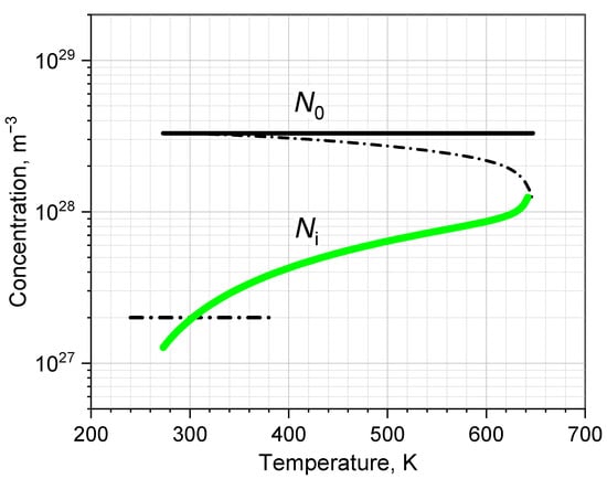 The ion concentration Ni in liquid water. The mark Ni = 2·1027 m−3 shows a level of previous Ni of the IM model [9]. The total particle concentration N0 is shown for comparison (solid—isochoric, dashed—along the critical water–vapor curve).