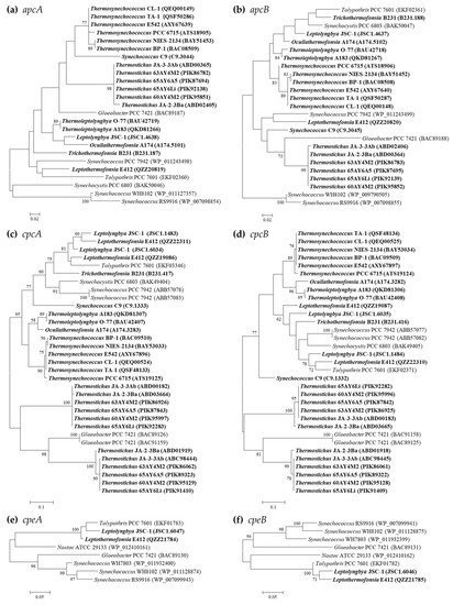 Phylogenetic inference of protein sequences encoding PBP subunits. The thermophilic cyanobacteria surveyed in this study are indicated in bold. Only bootstrap values > 50% are indicated at nodes. (a) apcA, (b) apcB, (c) cpcA, (d) cpcB, (e) cpeA, (f) cpeB.