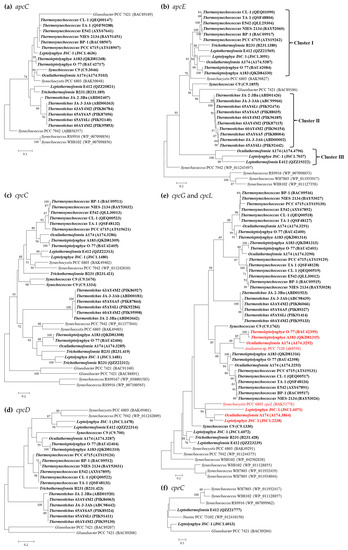 Phylogenetic inference of protein sequences encoding linker polypeptides. The thermophilic cyanobacteria surveyed in this study are indicated in bold. The putative cpcL is indicated in red. Only bootstrap values > 50% are indicated at nodes. (a) apcC, (b) apcE, (c) cpcC, (d) cpcG and cpcL, (e) cpcD, (f) cpeC.