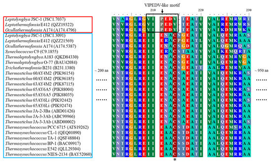 More interestingly, Leptolyngbya JSC-1, Leptothermofonsia E412, and Ocullathermofonsia A174 comprise two distinct apcE (Figure 2b). The amino acid sequences of apcE affiliated to cluster III show conserved VIPEDV-like motifs (Figure 3), which are identical to a recently identified far-red-specific area within apcE2 of cyanobacteria [28]. This result suggests that the three apcE of thermophilic cyanobacteria encode a phycobilisome linker associated with FRL photosynthesis, meanwhile highlighting their capabilities of adjusting a photosynthetic apparatus through chromatic adaptation. The other, conventional, apcE sequences show a highly conserved phytochrome-binding cysteine (Figure 3) that is missing in far-red sequences. The missing cysteine in apcE implies the non-covalent binding of phycocyanobilin and might relate to an important red-shift in the absorbance (e.g., 700 nm in the far-red Synechococcus PCC 7335, as opposed to 660 nm for covalent binding) [29]. Photoacclimation of a far-red light by Leptolyngbya JSC-1 and Leptothermofonsia E412 has been experimentally verified [30,31], and the responses to the ambient light environment might be mediated by two-component systems involved in signal transduction [32]. Moreover, the Ocullathermofonsia strain might expand the diverse array of far-red photosynthesizing cyanobacteria.
