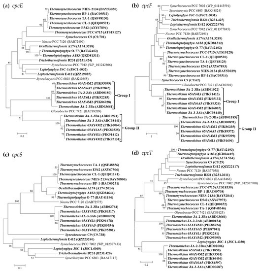 Phylogenetic inference of protein sequences encoding PC-associated phycobilin lyases. The thermophilic cyanobacteria surveyed in this study are indicated in bold. Only bootstrap values > 50% are indicated at nodes. (a) cpcE, (b) cpcF, (c) cpcS, (d) cpcT.