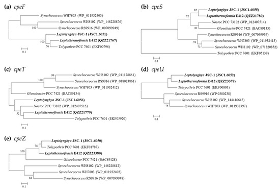 PE-associated phycobilin lyases are only in possession of Leptolyngbya JSC-1 and Leptothermofonsia E412 (Table 4), showing a consistent pattern of gene category and number. The two thermophiles exhibit a high degree of homology (71.9–78.2%) with the cpeF of filament Tolypothrix PCC 7601, an experimentally confirmed bilin lyase that is responsible for the attachment of the doubly ligated PEB to Cys-48/Cys-59 of cpeB [43]. The clade formed by the three strains is divergent from the marine Synechococcus strains, as revealed by the cpeF phylogram (Figure 5). The phylograms of cpeU and cpeZ are congruent with the cpeF phylogram, whereas the cpeS and cpeT of the two thermophilic cyanobacteria appear to be divergent from that of Tolypothrix PCC 7601 (Figure 5). Homologs of cpeZ in the two thermophiles may function as chaperones, facilitating cpeF and cpeB interaction by stabilizing cpeBs conformation [44]. Moreover, homologs of cpeS, cpeT, and cpeU in the two thermophiles may attach PEB to Cys residues of the cpeB subunit of PE [44,45].