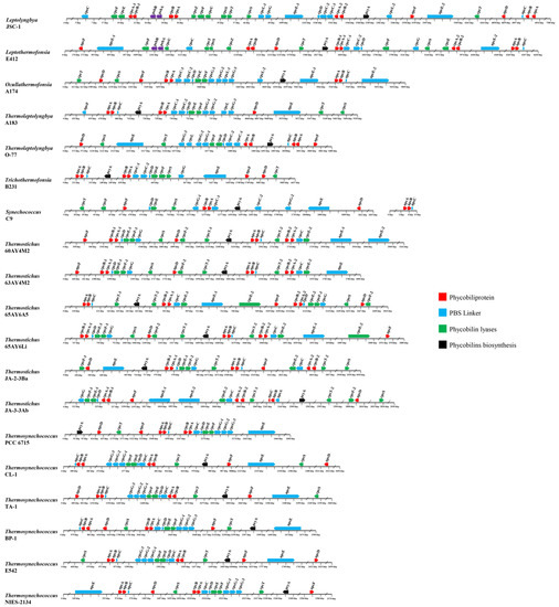 Overall, all the specific bilin lyases might ensure the binding of the correct bilin to the corresponding cysteine residue with the correct stereochemistry, finally contributing to the post-translational modification and assembly of PBP in vivo into mature light-harvesting complexes. Future experimental studies should be carried out to elucidate how these bilin lyases chromophorylate the PEB-binding sites on PBP in the thermophilic cyanobacteria using, e.g., biochemical assays and site-directed mutagenesis.