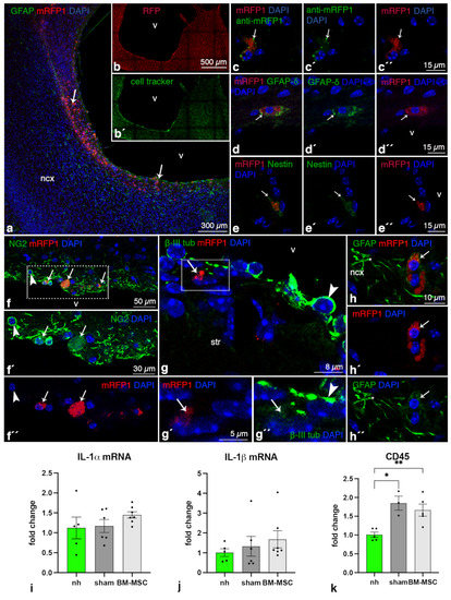 2.1. BM-MSCs Injected into the Ventricles Integrate and Survive Fourteen Days in the Damaged Periventricular Walls