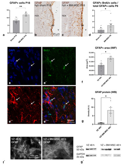 2.7. BM-MSCs Stimulate the Astrocyte Proliferation in the Ventricular Zone In Vitro