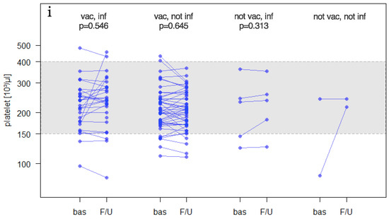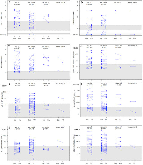Course of different aPLs and platelet counts for different subgroups according to vaccination and infection status. Panels (a–c) show lupus anticoagulants (DRVVT ratio and screening with (+) and without (−) VKA and MIXCON LA ratio), panel (d) shows anti-β2-GPI domain I IgG antibodies, panels (e,f) show anti-β2-GPI IgM- and IgG-antibodies, panels (g,h) show aCL IgM- and IgG-antibodies, and panel (i) shows the platelet counts. The vertical axes are on log-scale. p-values were calculated with the Wilcoxon-matched pairs test on a logarithmic scale. The shaded area shows the reference ranges of each assay. Points are shaded and a stronger color is caused by overlaying the data points. The DRVVT ratio is only evaluated in patients with positive DRVVT screening. Only these quantifications were statistically compared but the respective panel also illustrates cases with negative screening (with overlaying data points). vac.: COVID-19 vaccination; inf.: COVID-19 infection; Scr. neg: screening negative; bas: baseline; F/U: follow-up; DRVVT: dilute Russell’s viper venom time; VKA+: patients on vitamin K antagonist treatment; VKA–: patients without vitamin K antagonist treatment; MIXCON-LA: a lupus-sensitive aPTT-based assay; Anti-β2-GPI: Anti-β2-Glycoprotein I; IgG: Immunoglobulin G; IgM: Immunoglobulin M; aCL: anticardiolipin antibody; platelet: platelet count.