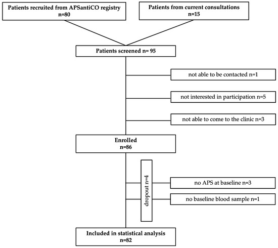 In addition to the 80 patients screened as part of the APSantiCO registry, 15 patients were screened from the current consultations, resulting in 95 screened patients in total. Of these, 86 patients were enrolled in the study. Four patients were screening failures who either did not fulfil the criteria of thromboembolic APS at the baseline (n = 3) or had not been in the outpatient clinic before the first COVID-19 vaccination (n = 1). A total of 82 patients gave their written informed consent and were included in the final statistical analysis (see Figure 2).