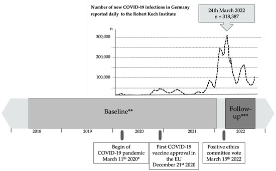 Timeline of blood sampling. The figure shows the number of new COVID-19 infections in Germany based on data provided by the Robert Koch Institute [31]. * The global spread of COVID-19 was declared a pandemic by the WHO on 11 March 2020. ** Baseline blood parameters were taken from each patient’s medical record. All blood specimens were taken before the first COVID-19 infection or COVID-19 vaccination (median: 200 days; 25–75% percentiles: 102.5–354.0; timeframe: 2 May 2018–6 January 2022). *** Follow-up blood parameters were taken after the last COVID-19 infection or COVID-19 vaccination at the patient’s visit to the outpatient clinic (median: 142 days; 25–75% percentiles: 88.5–199.0; timeframe: 17 March 2022–24 October 2022). Two patients were neither infected nor had they been vaccinated. In these patients, the time span between the baseline and follow-up blood parameters was 434 and 177 days, respectively.