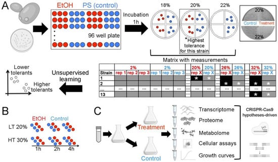 Experimental design. (A) Setting the phenotypes. PS: physiological solution; red and blue circles: treatment and control, respectively. The box shows examples of plates used to determine the highest EtOH tolerance. The experimental conditions that allowed or inhibited growth are represented by gray and black boxes, respectively. *: The highest EtOH level. (B) Time-course experiment. (C) Further experiments and hypothesis testing using mutants.