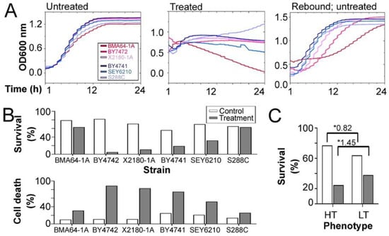 Cell growth and flow cytometry assays were used to evaluate EtOH stress severity. (A) Growth curve analyses of the populations of untreated cells, cells treated with the highest EtOH level previously defined, and the population rebound experiments (growth curves of the populations of cells inoculated in pure YPD medium after 1 h of treatment with the highest tolerated EtOH level). (B) Percentages of live and dead cells of each strain under control and treatment conditions. (C) Percentages of live cells of each phenotype under control and treatment conditions. The numbers above the bars are the “rate” comparing the average of the LT strains divided by the average of the HT strains. Hence, a rate > 1 indicates more live cells of the LT strains. *: Rate between LT divided by HT.