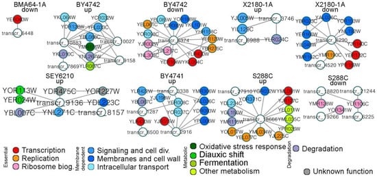 We analyzed the function of EtOH stress-responsive lncRNAs to assess whether their response was strain specific; this analysis is hereafter referred to as lncRNA propagation analysis. We selected significant EtOH stress-responsive genes based on the differential transcriptomic expression of each strain. We selected proteins encoded by differentially expressed genes whose expression level matched that of the examined lncRNA. The systems signaling using the diffusion algorithm [31] throughout lncRNA–protein interactions revealed the relevant routes from each EtOH stress-responsive lncRNA of each strain. Next, we selected proteins surrounding the relevant routes to form subnetworks. For instance, (1) the upregulated genes “A”, “B”, “C” and “D” encoded proteins that interacted with the upregulated lncRNA “X”; (2) however, only proteins “A” and “D” surrounded the relevant route from the lncRNA “X” to “Y”; (3) therefore, the new subnetwork consists of lncRNAs “X” and “Y” and the coding genes “A” and “D”. The analysis corroborated our hypothesis that EtOH stress-responsive lncRNAs function in distinct pathways in a strain-specific manner. Interestingly, these pathways were generally associated with EtOH tolerance and response. Finally, we defined four broad functional categories for EtOH stress-responsive lncRNAs: life-essential, membrane-dependent, metabolic, and degradation process-related (Figure 3; Table 2; Supplementary Figure S26). EtOH stress-responsive molecules in those pathways are summarized in the Supplementary Text (“Results”, topics “4.3.2” and “4.3.3”).