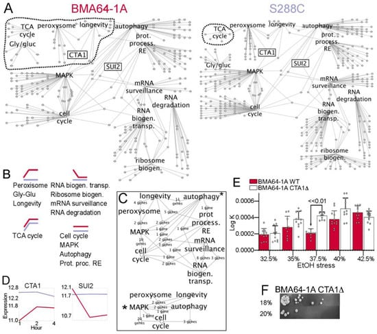 After receiving MAPK signals, the first pathways that showed significant expression differences between the HT and LT models were longevity and peroxisomes (Figure 4B,C). Therefore, we manually searched for genes surrounding these essential pathways that may have an effect on the emergence of the HT and LT phenotypes. CTA1 mediates MAPK signaling to the peroxisome and longevity. Peroxisome, longevity and CTA1 exhibited the same expression profile over time (activation in BMA64-1A and stable-like expression in S288C) (Figure 4A–D). By inactivating CTA1 in the BMA64-1A strain, we tested the hypothesis that CTA1 inactivation is associated with the EtOH phenotype. Our hypothesis was corroborated because the BMA64-1A CTA1Δ mutant matched the LT phenotype, with the tolerance to EtOH reduced to 18–20% and an improvement in population rebound after relief (Figure 4E,F).
