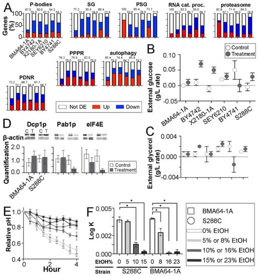 Analysis of genes related to EtOH stress-responsive storage and degradation mechanisms and external conditions of the medium for EtOH-stressed cells. (A) The numbers above the bars indicate the percentage of genes related to EtOH stress-responsive storage and degradation systems that were not differentially expressed (D,E) or upregulated. PB, P-bodies. SG, stress granules. PSG proteasome storage granules. RNA cat. proc., RNA catabolic process. PPPR, protein polyubiquitination and positive regulation of ubiquitination. PDNR, protein deubiquitination and negative regulation of ubiquitination. The full list of affected genes is reported in the Supplementary Text, ‘Results’, topic ‘4.3.5.’ (B,C) Glucose and glycerol levels. Each Y value represents a concentration rate between 1 and 0 h within the control and treatment groups. Therefore, higher values indicate lower glycerol yield or estimated glucose consumption after 1 h. (D) Western blot results. C and T over the bands indicate the control and treatment groups. (E) Normalized YPD pH level (see Equations (1) and (2) in the Supplementary Text, ‘Methods’, topic ‘3.1’). In the right box is depicted the colors and shapes of this graphic. (F) Cell growth in the pH quantification experiment (E). *, adjusted p value < 0.0001.