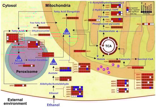 S. cerevisiae can use accumulated EtOH as a substrate for aerobic respiration [3], consistent with the general idea of our “EtOH stress-buffering” model (Figure 6); all strains were cultivated here under aerobic conditions. The core of our EtOH stress-buffering model is the diauxic shift and TCA cycle. Overall, our model suggests that chronic EtOH stress induces a diauxic shift by consuming EtOH and glycerol. This process intensifies acetyl-CoA, fatty acid, TCA cycle and peroxisome activities, resulting in increased energy production to buffer intense stress. Below, we present results from the literature and their correlation with our findings to support and verify our model. We only included the details of the reactions and functions of genes and metabolites in the context of our EtOH stress-buffering model (Table 3; Figure 6) because most other steps are common TCA cycle reactions. Therefore, details of the TCA cycle are provided in the Supplementary Text (“Discussion”, topic “4”).
