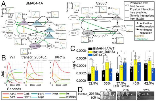 Subsystem model harboring the lncRNA transcr_20548, the diauxic shift, and EtOH stress-buffering genes. (A) BMA64-1A and S288C subnetworks. Small boxes represent the time-course data for each gene. Nodes with the same color have a similar time-course profile. These subnetworks were manually curated, including published data, information from the SGD database, and transcriptome time-course data from BMA64-1A and S288C. (B) BMA64-1A subnetwork dynamic network simulations of ordinary differential equations based on the transcriptome time-course of treatment conditions that simulate gene expression in virtual BMA64-1A WT and mutants. (C) Population rebound after stress relief in WT and BMA64-1A CRISPR–Cas9 mutants. * indicates a p value < 0.01. (D) EtOH tolerance spot test.