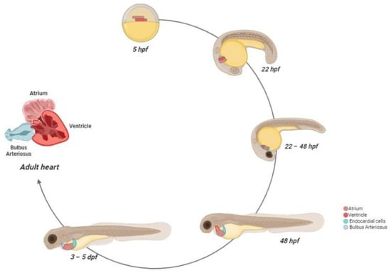 - Hu, N.; Sedmera, D.; Yost, H.J.; Clark, E.B. Structure and Function of the Developing Zebrafish Heart. Anat. Rec. 2000, 260, 148–157. [Google Scholar] [CrossRef]
