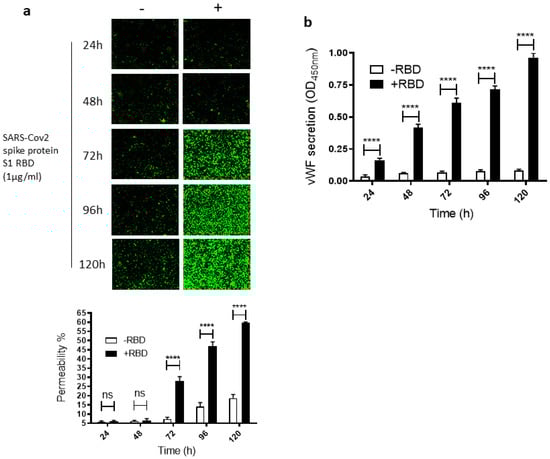 Time-dependent effect of the SARS-CoV-2 spike protein S1 RBD on EA.hy 296 cell monolayer permeability and its vWF secretion. EA.hy 296 cells grown on biotinylated gelatin to confluence were treated without or with 1 µg/mL SARS-CoV-2 spike protein S1 RBD for 24–120 h. After the incubation, the medium was removed (to use for analyzing the secretion of vWF and the proinflammatory cytokines), and FITC-streptavidin was added to the cells for 10 min. Then, the cells were washed and fixed with 4% PFA, and FITC-streptavidin bound to biotinylated gelatin was visualized by fluorescence microscopy and quantified fluorescence intensity by using Image J software. Green fluorescence indicates areas of the EA.hy 296 cell monolayer permeable to FITC-conjugated streptavidin. Images were taken at 10× magnification using a fluorescence microscope. (a) Visualization of time-dependent induction of permeability in EA.hy 296 cell monolayers by 1 µg/mL SARS-CoV-2 spike S1 RBD treatment. (lower panel) Represents the quantification data of (a), which was presented as the percentage (%) permeability of the EA.hy 296 cell monolayer. (b) vWF secretion by EA.hy 296 cell monolayer treated without (−RBD) or with 1 µg/mL RBD (+RBD) for 24–120 h. Statistical significance was measured by two-way ANOVA by comparing the treated with the untreated control (−RBD) at each time point (**** p < 0.0001. ns, not significant).