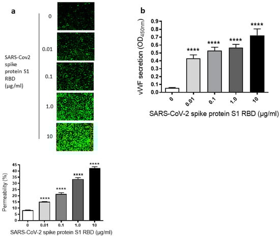 Dose-dependent effect of SARS-CoV-2 spike S1 RBD on EA.hy 296 cell monolayer permeability and vWF secretion. (a) Visualization at 10× magnification of 0–10 µg/mL SARS-CoV-2 spike S1 RBD-induced permeability in EA.hy 296 cell monolayer. (lower panel) Represents the quantification data of (a). (b) vWF secretion by EA.hy 296 cell monolayers treated with 0–10 µg/mL RBD for 72 h. Statistical significance was measured by one-way ANOVA comparing the treated with the untreated control (**** p < 0.0001).