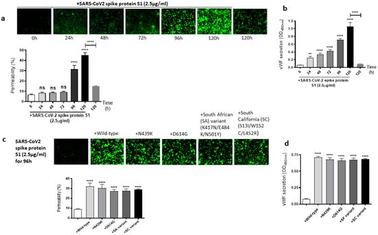 Effect of the SARS-CoV-2 spike protein S1 and its mutants on EA.hy 296 cell monolayer permeability and its vWF secretion. (a) Visualization at 10× magnification of SARS-CoV-2 spike protein S1-induced permeability in a time-dependent manner in EA.hy 296 cells monolayers. (lower panel) Represents the quantification data of (a). (b) vWF secretion by EA.hy 296 cell monolayer treated with 2.5 µg/mL spike protein S1 for 0–120 h. (c) Visualization at 10× magnification of permeability of EA.hy 296 cell monolayer treated without or with 2.5 µg/mL of the SARS-CoV-2 spike protein S1 (WT) or its mutants for 96 h. (lower panel) Represents the quantification data of (c). (d) vWF secretion by EA.hy 296 cell monolayers treated with 2.5 μg/mL spike protein S1 or its mutants for 96 h. Statistical significance was measured by two-way ANOVA comparing the treated with the untreated control (** p < 0.01, **** p < 0.0001. ns, not significant).