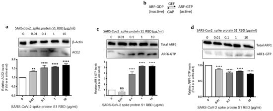 Since SARS-CoV-2 requires ACE2 and ARF6 to enter human cells [43,44], we assessed where ACE2 expression and ARF6 activation are altered in SARS-CoV-2 spike S1 RBD- stimulated EA.hy 296 Cells. For this purpose, we lysed EA.hy 296 cells treated with 0–10 μg/mL of the RBD for 72 h and used the cell lysates for analyzing the expression of ACE2 expression and ARF6 activation. When the ACE2 expression was analyzed by immunoblotting using the ACE2 inhibitory antibody, we saw a slight increase in ACE2 protein expression in the 0.01 μg/mL RBD-treated cells but the expression did not increase further as the RBD amount increased in the treatment (Figure 4a).
