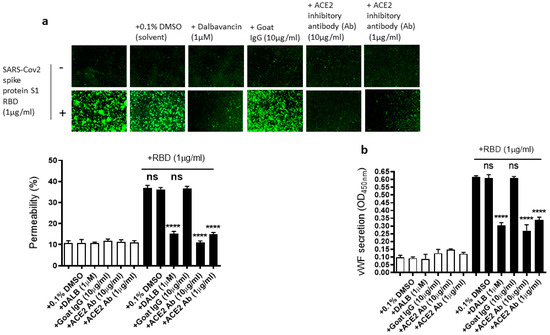 As we showed that the SARS-CoV-2 Spike protein S1 RBD upregulates ACE2 expression and ARF6 activation, we next determined the effect of the activation of ACE2 and ARF6 on the RBD-induced EC permeability and vWF secretion. Several studies reported a promising anti-COVID-19 drug candidate, the lipoglycopeptide antibiotic dalbavancin, which directly binds to ACE2 with high affinity and thereby blocks its interaction with the SARS-CoV-2 spike protein in vitro [47,48]. The ACE2 inhibitory antibody is also shown to bind ACE2 and thereby inhibit SARS-CoV-2 virus entry into the cells [49,50]. Therefore, we hypothesized that dalbavancin and the ACE2 inhibitory antibody may affect SARS-CoV-2 spike protein-induced EC permeability and vWF secretion in EA.hy 296 cells. For this purpose, dalbavancin or the ACE2 inhibitory antibody pretreated EA.hy 296 cells were used to assess RBD-induced EC permeability and vWF secretion. We observed that dalbavancin and the ACE2 inhibitory antibody markedly decreased the EC permeability (Figure 5a) and vWF secretion (Figure 5b) in the RBD-treated cells. However, the solvent DMSO or control goat IgG did not affect the RBD-induced EC permeability and vWF secretion.