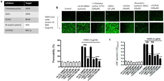 We hypothesized that these inhibitors may affect the RBD-induced EC permeability and vWF secretion by inhibiting the signaling pathway downstream of ACE2. To test this hypothesis, we analyzed the effect of chlortetracycline, QS11, SC-514, NAC, and Y27632 pretreatment on the EC permeability and vWF secretion in RBD-treated EA.hy 296 cells. We found that Chlortetracycline, SC-514, NAC, and Y27632 significantly inhibited the RBD-induced EC permeability (Figure 6b) as well as vWF secretion (Figure 6c), whereas they did not show any effect on the RBD-untreated cells.
