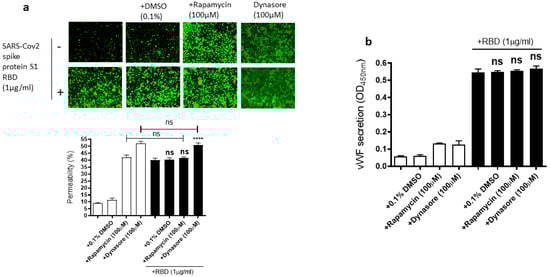 Effect of rapamycin and dynasore on the RBD-induced EC permeability and vWF secretion. EA.hy 296 cells pre-incubated without or with rapamycin or dynasore for 1 h were treated without or with 1 μg/mL SARS-CoV-2 the spike protein S1 RBD for 72 h. (a) Visualization at 10× magnification of the effect of rapamycin and dynasore on the RBD-induced EC permeability. (lower panel) Represents the quantification data of (a). (b) The effect of rapamycin and dynasore on the RBD-induced vWF secretion from EA.hy 296 cells. Statistical significance was measured by one-way ANOVA comparing the RBD-treated group with the control RBD-untreated group (**** p < 0.0001. ns, not significant).